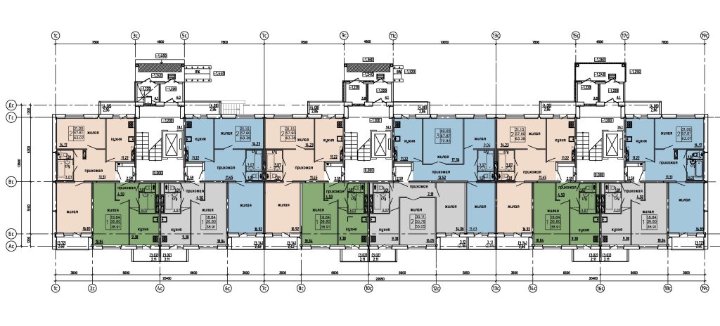 20 квартир общей площадью – 63,07 м2, жилой – 31,00 м2;