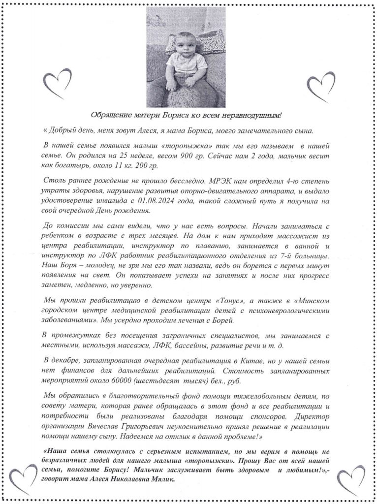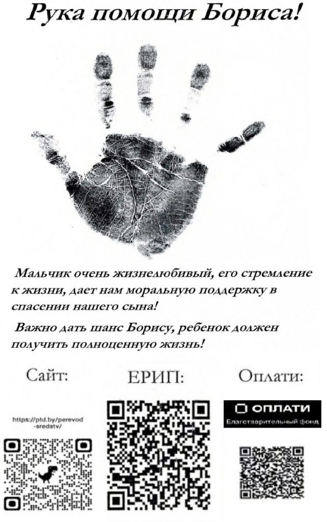С просьбой об оказании в помощи лечении ребенка мама Бориса обратились к нам, а мы в свою очередь просим Вас помочь нам в сборе средств для лечения мальчика. 1. Оказать нам помощь возможно сбором денежных средств и переводом па наш благотворительный расчётный счёт: p/c BY41BPSB30153404160169330000, Д. О. №777 ОАО «Сбер Банк», г. Минск, бульвар имени Мулявина, д. 6, БИК BPSBВY2Х. Получатель Фонд «Помощь тяжелобольным детям». Назначение платежа «Добровольное пожертвование». 2. На официальном сайте Вы можете: Совершить добровольное пожертвование для лечения тяжелобольных детей с помощью банковских карт: ptd.by 3. Вы можете поддержать гуманитарный проект фонда: Мы создали проект гуманитарной помощи, Вы можете выслать любую гуманитарную помощь (продовольственные, непродовольственные товары, быт., химию, одежду, канцелярию, печатную продукцию, игрушки и т. д.) по почтовому адресу фонда: г. Минск, абонентский ящик №2, индекс: 220023. 4. Осуществить перевод денежных средств на наши благотворительные валютные счета благотворительного фонда: EUR BY21BPSB30153404160329780000; USD BY38BPSB30153404160298400000; RUBBY42BPSB30153404160456430000 Д. О. №777 ОАО «Сбер Банк», г. Минск, бульвар имени Мулявина, д.6, БИК BPSBВY2Х. Получатель Фонд «Помощь тяжелобольным детям». Назначение платежа «Добровольное пожертвование». 5. Совершить платёж в системе «ЕРИП». Код услуги 5265381. 1. Пункт системы расчёт «ЕРИП» 2. Благотворительность, общественные объединения. 3. Помощь детям, взрослым. 4. Помощь тяжелобольным детям. 5. Добровольные взносы. 6. Совершить платёж через электронную платёжную систему «Оплати»: https://getapp.o-plati.by/map/?app_link=o-plati://o-miniapp/037a258c-dlcc-4637-b9a2-2fd9ac628989&utm_source=menu. 7. Выполнить USSD — запрос МТС: Наберите — *222*45#. Выберите сумму пожертвование: 2 рубля. 8. Выполнить USSD — запрос Life: Наберите -*222*45#. Выберите сумму пожертвования: 1, 2, 5 рублей. 9. Вы можете совершить звонок на нашу благотворительную Республиканскую круглосуточную линию с домашнего телефона: 8-902-216-16-16 стоимость пожертвование 5 Белорусский рублей, данная услуга доступна со стационарного телефона. 10. Выполнить USSD — запрос А1: Наберите -*222*45#. Выберите сумму пожертвования: 2, 5, 10 рублей. Отправить А1 SMS на короткий номер 2245, сумма пожертвование: 2 рубля. Совершить пожертвование через приложение Al banking.